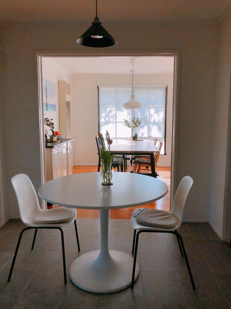 주방에서 바라본 다이닝룸이에요. 손님을 초대하면 큰 다이닝 테이블에서 밥을 먹고 평소엔 원형테이블을 이용해요.