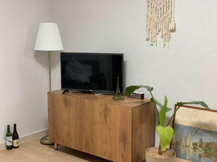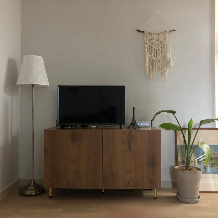 32인치 티비에 딱인 사이즈의 우드톤 거실장입니다.