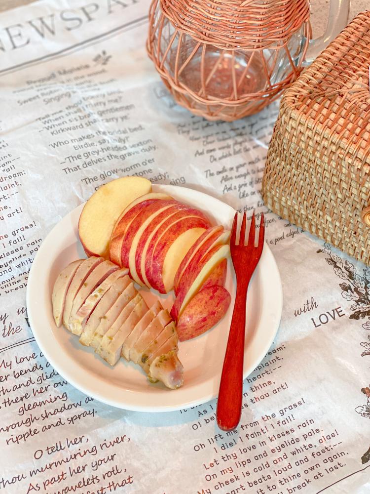 아침은 사과 반쪽과 닭가슴살을 먹어요.