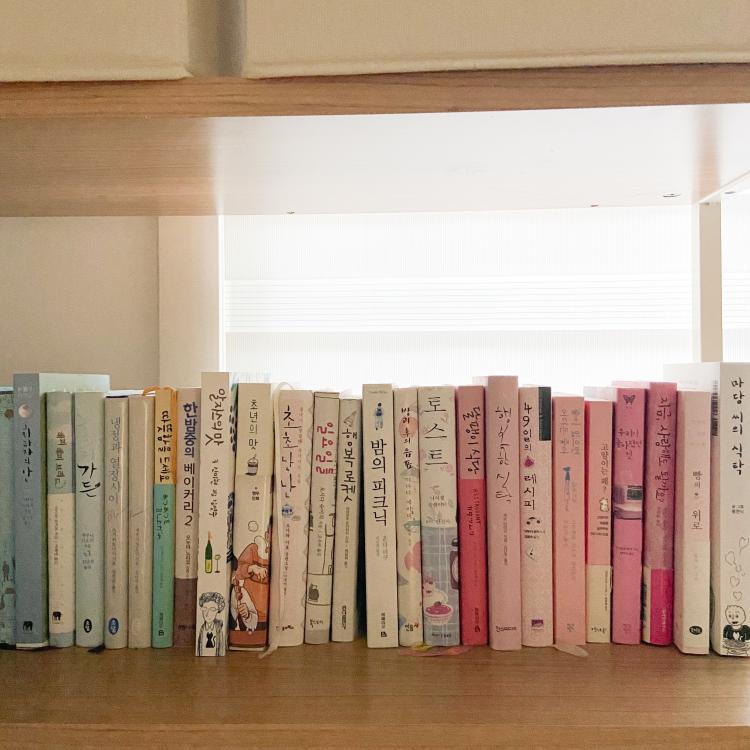 책장엔 제가 좋아하는 책들이 잔뜩 꽂혀있어요.
