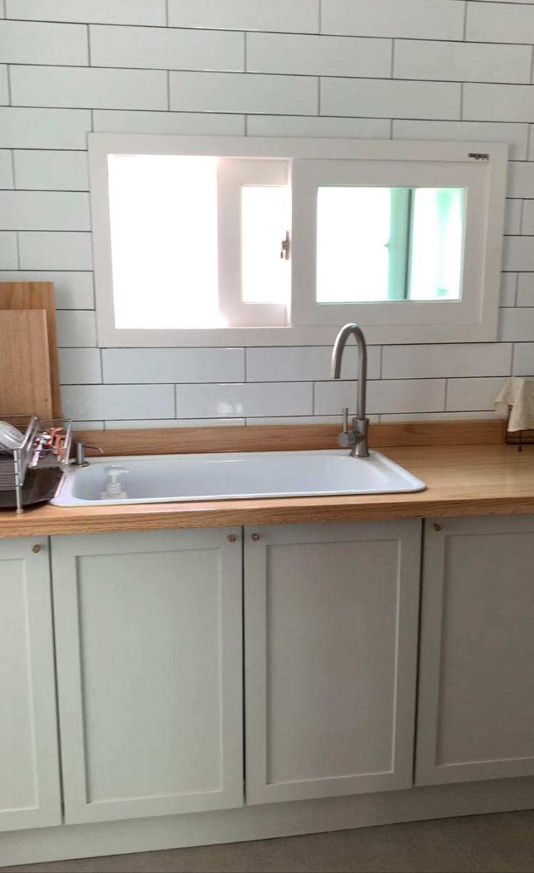 원목과 잘 어울리는 화이트 법랑싱크볼을 쓰고 있어요. 물자국이 없어서 좋습니다.