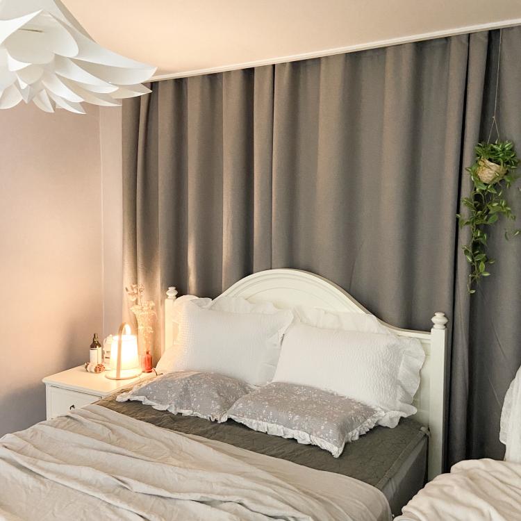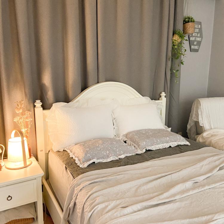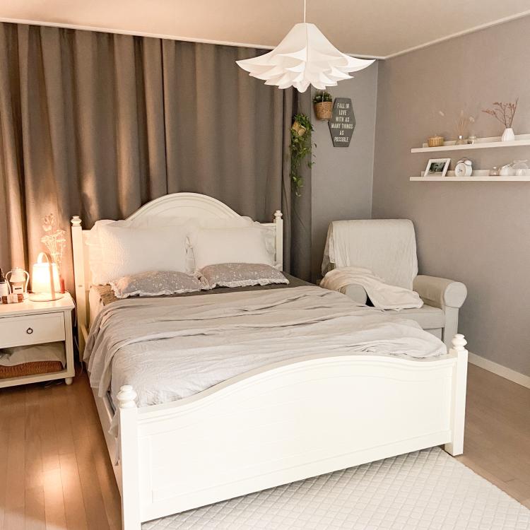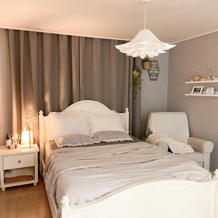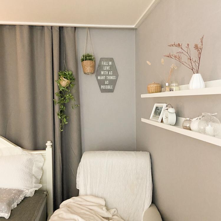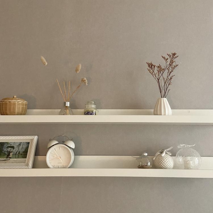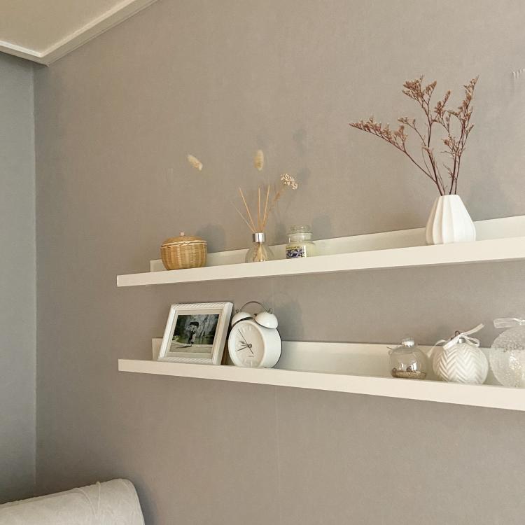 침실 선반 위엔 침실 인테리어와 비슷한 톤앤매너의 소품만 올려두었어요.
