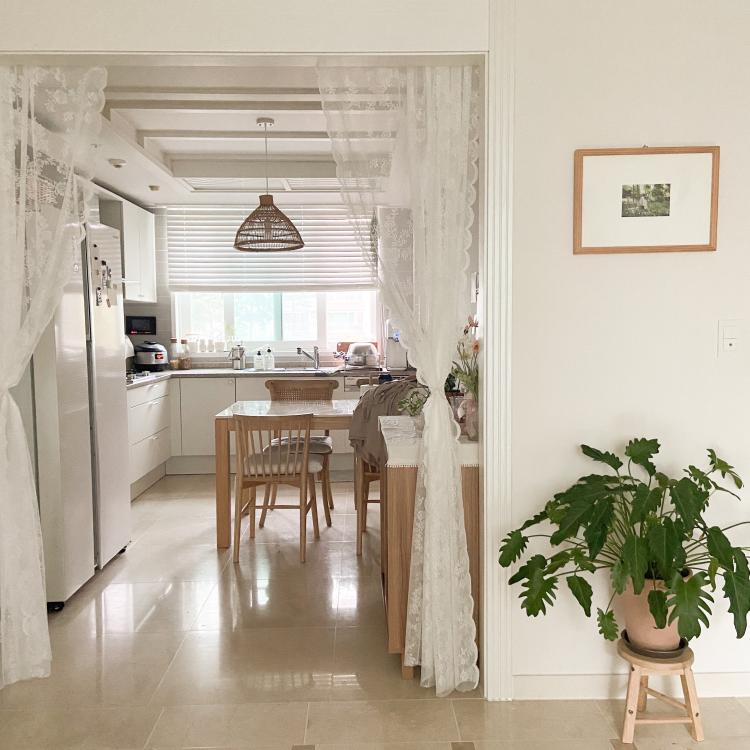 전체적으로는 이렇게 생겼어요 :) 레이스 커튼으로 거실과 주방의 공간을 분리해주고 있답니다!