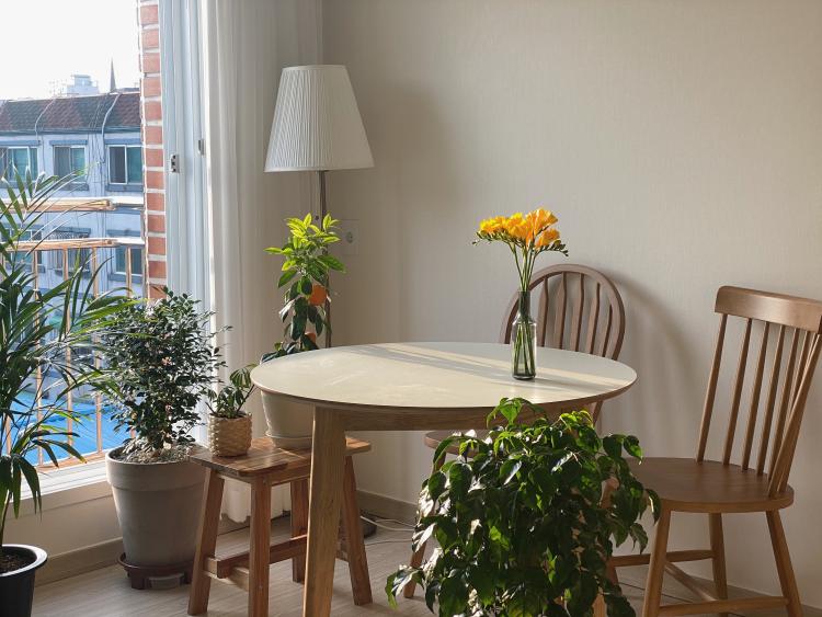 집 사진 중 제일 좋아하는 사진이에요. 꼭 카페 같지 않나요? ㅎㅎ 식물과 햇빛이 인테리어를 완성시켜주었어요.