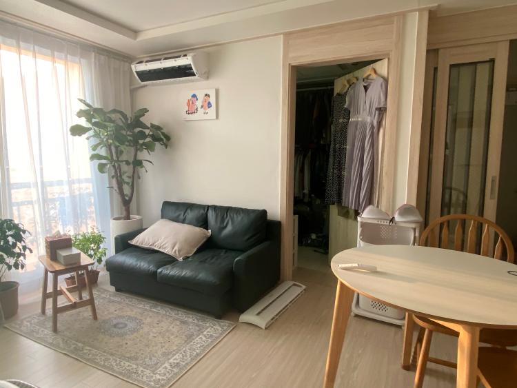 조금 지저분한 사진이지만; 에어컨 청소를 하려다 예뻐보여 찍었어요ㅎㅎ 작은 거실에 알차게 들어선 가구들이에요. 코지한 분위기를 뿜뿜! 좁지만 애정하는 저의 신혼집입니다 :)