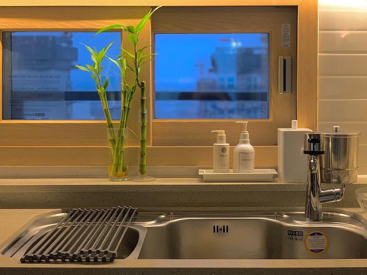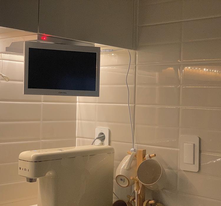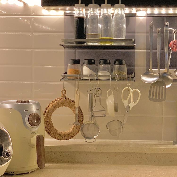 싱크대 상부장 밑에 간접 조명을 설치했어요. LED 조명이라 밝고 은은한 전구색이 따뜻한 분위기를 자아냅니다.
