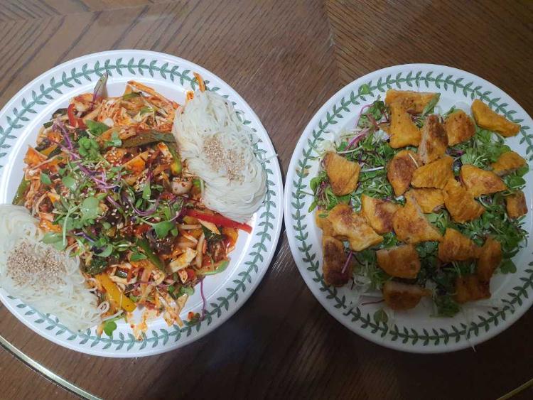 뭐해먹을까 고민끝에 간단하게 ^^;;;골뱅이무침 소면 치킨너겟 샐러드로 애들점심차려줬네요