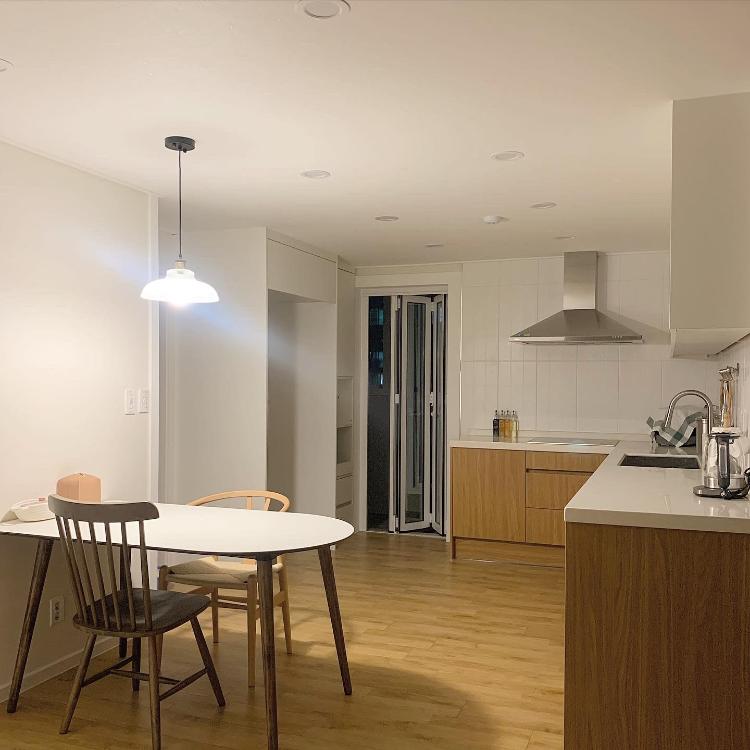 한쪽은 원형 라운드로, 한쪽은 직선으로 마감된 테이블을 들였어요. 공간 활용에 참 좋아서 만족스러워요!