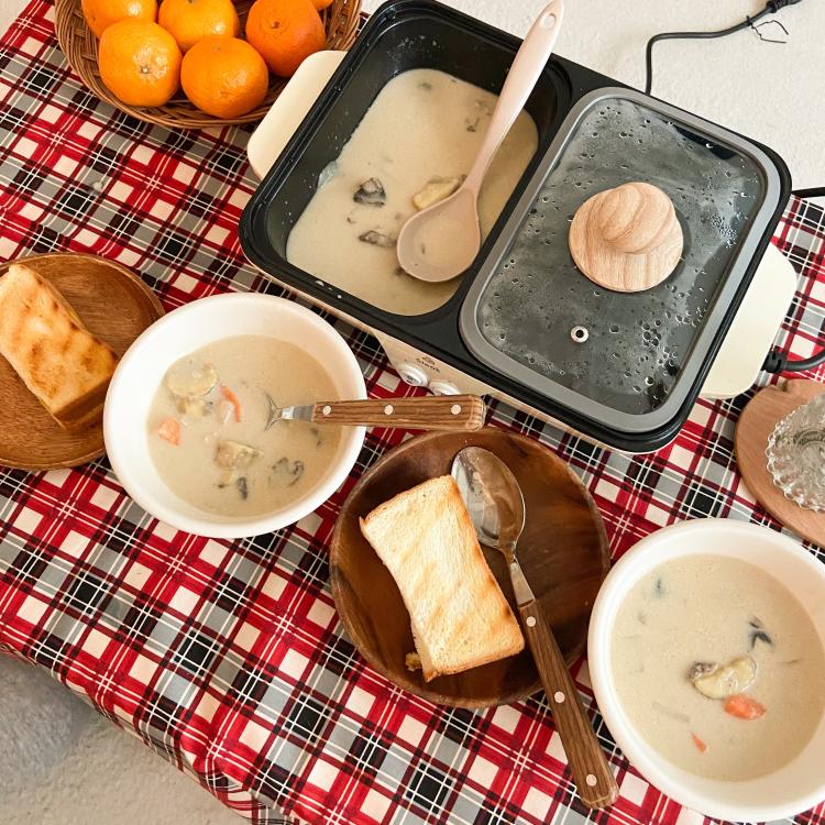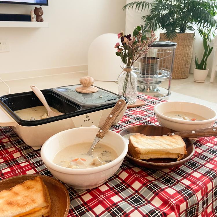 한 솥 가득 끓여두었던 크림스튜를 하이메이드 멀티그릴 한 쪽에 담아 데웠는데,