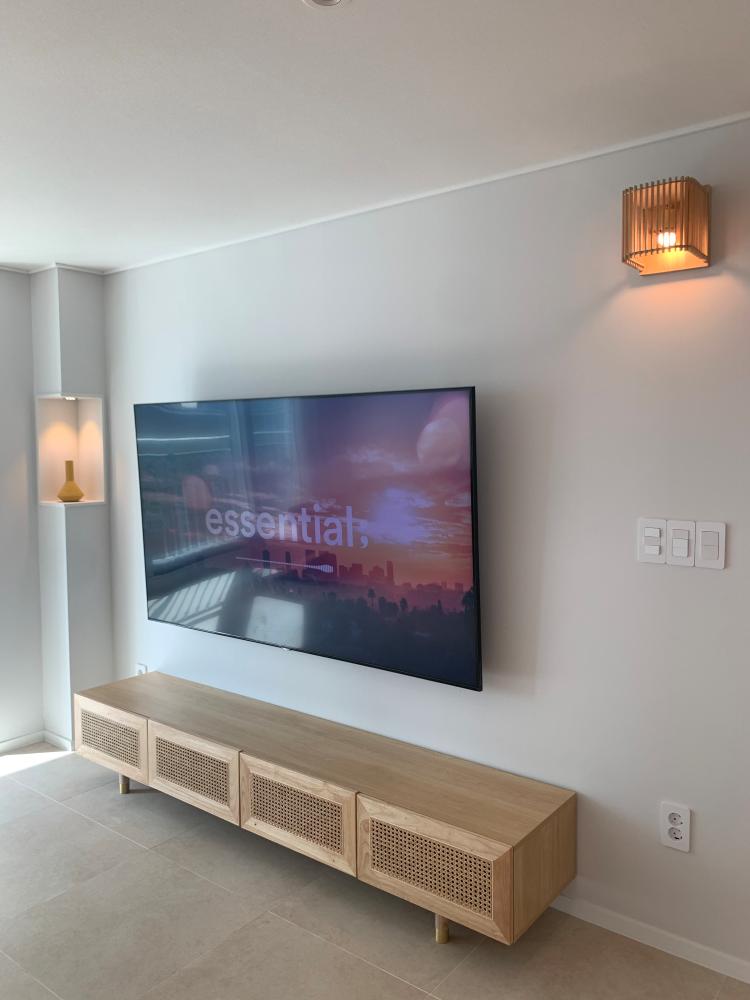삼성 75인치 티비와 작은 갤러리가 공존하는 거실이에요,