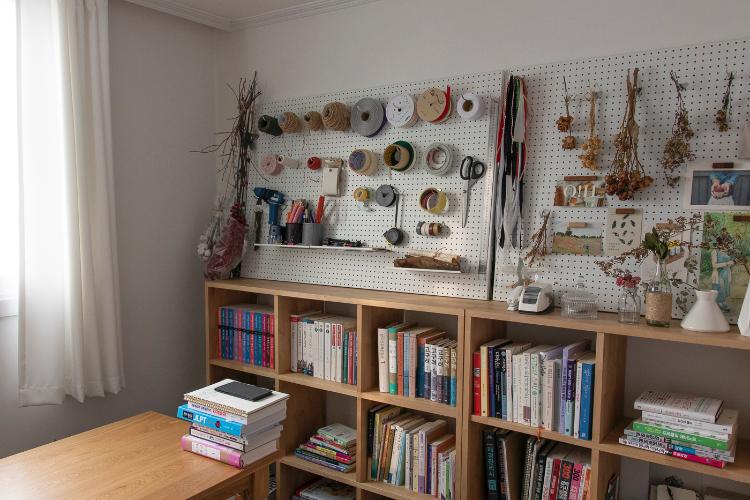 작업방 청소하고 사진 찍었어요. 타공판에 물건도 제자리에 걸어두고 안보는 책들도 정리하고 은근 시간 걸리네요.