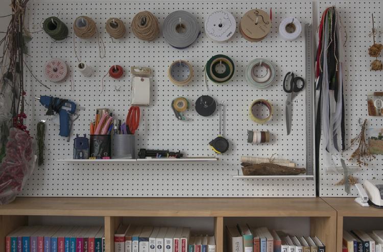 취미방인 작은방. 타공판에 문구류와 포장재료를 잘 정리해놓았어요. 한눈에 보이니까 찾기 쉬워서 좋아요. 책장 위에 올려두고 쓰고 있습니다.