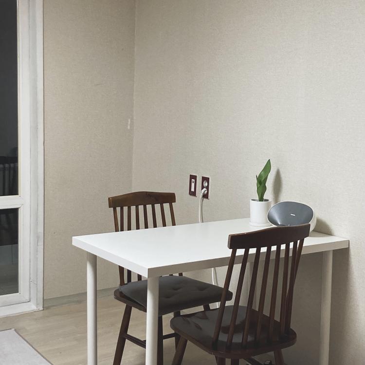 기존에 컴퓨터 책상으로 쓰던 테이블을 임시로 거실 테이블로 쓰고 있어요 -:)