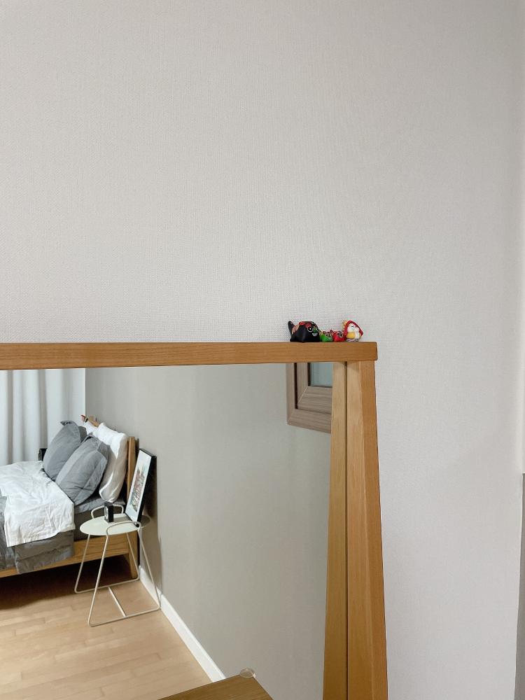 화장대 거울에 비치는 침실 풍경이 좋아요.