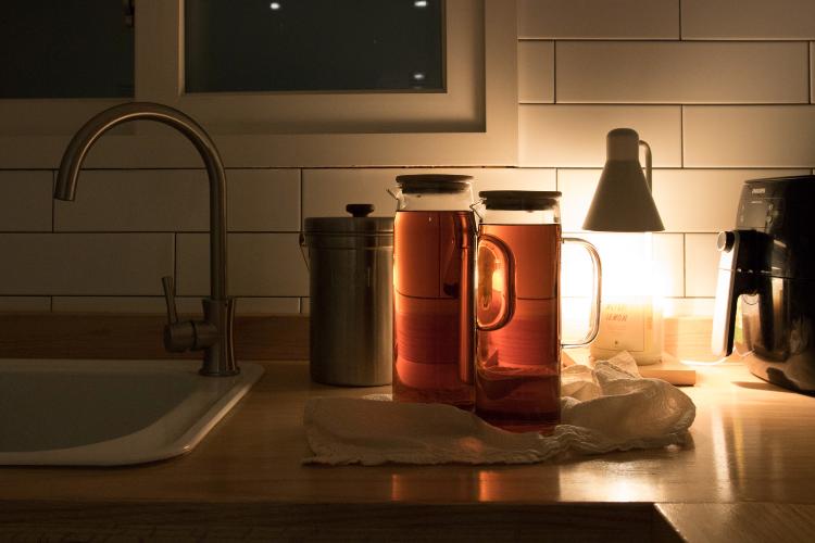 주방을 마감하며 물 끓여놨어요. 보이차 티백으로 우린 물 맛도 있고 색깔도 예쁘네요.