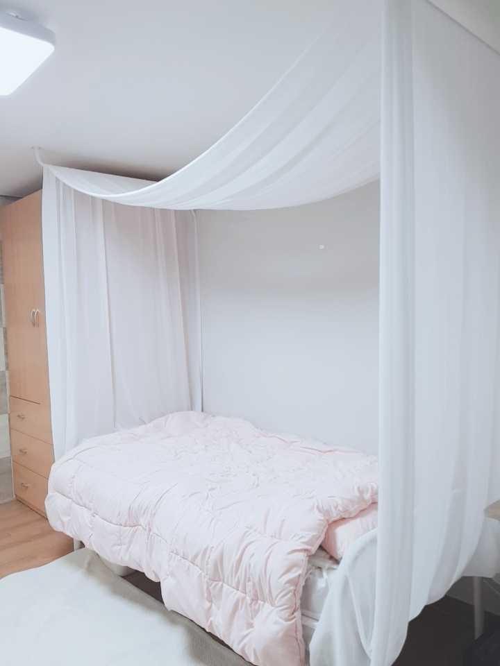 침대 위에 공간분리를 위해서 천을 달았습니다