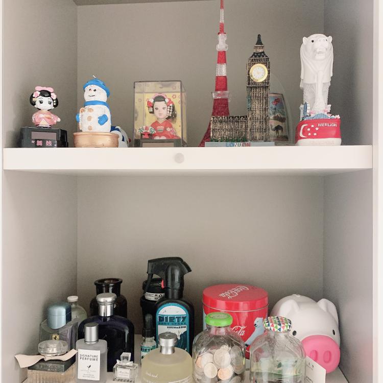 붙박이장 선반위에요~ 여행다니며 사온것들과 사용하지 않는 향수 등을 뒀어요 ㅎㅎ
