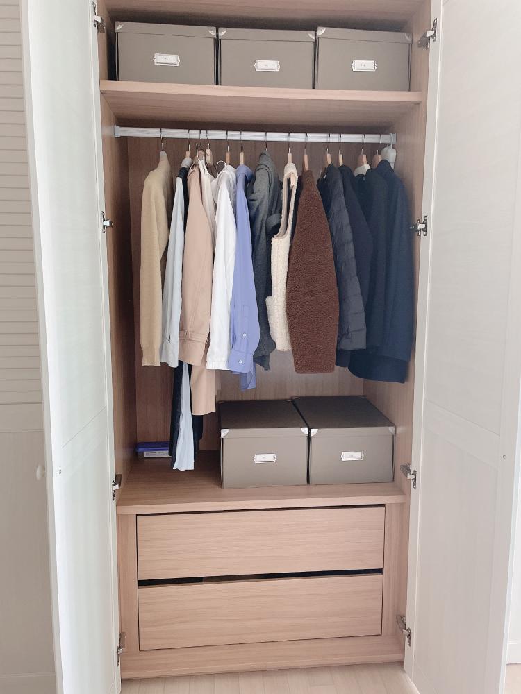안방 붙박이장입니다 :) 종이 박스를 활용해서 계절이 다른 옷들을 보관하고 있어요