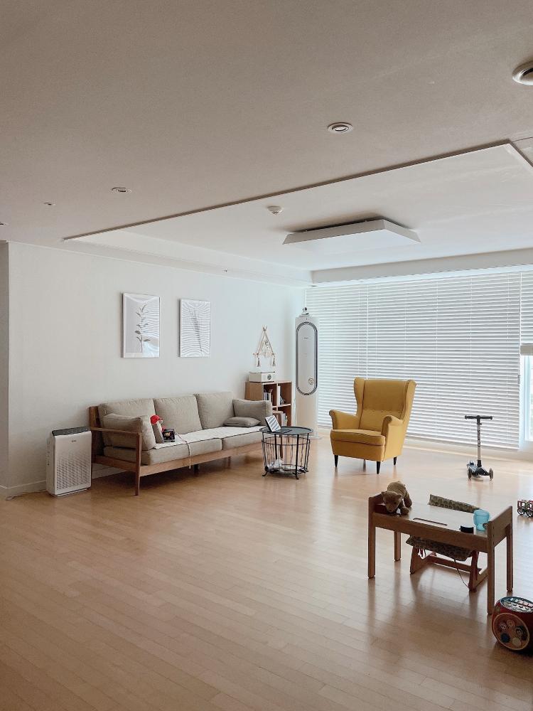저희집 거실은 티비없이 대면형으로 쇼파를 놓았었는데요. 맞은편 2인쇼파가 수명을 다해서 비워냈어요. 처음엔 어색했는데 지금은 조금 적응 됐어요 ^^