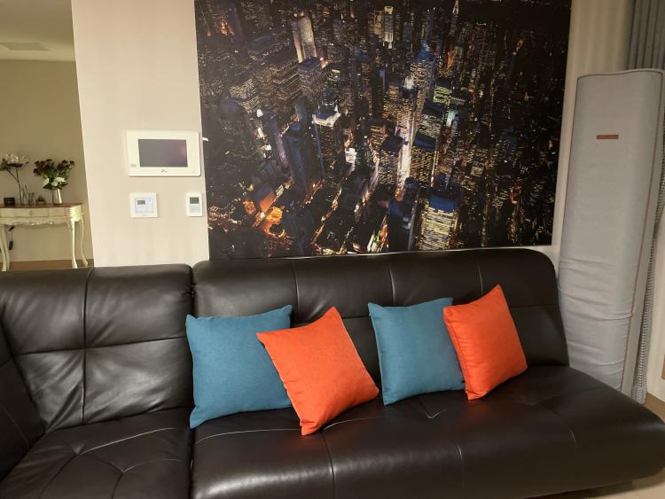 대형 액자와 컬러 소파로 꾸민 거실이에요