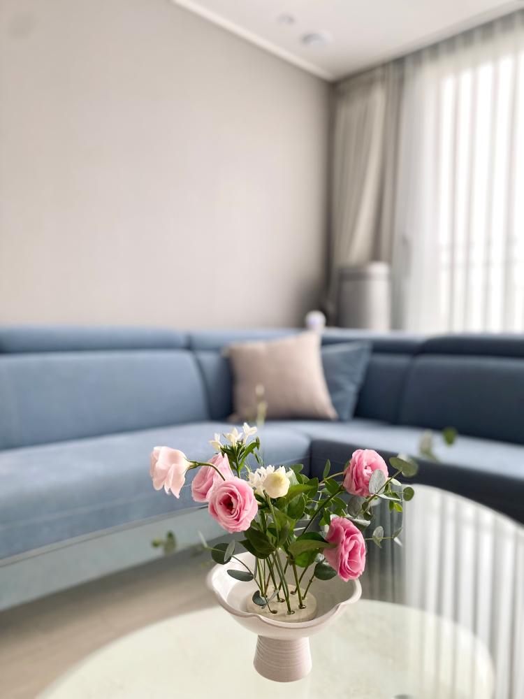 시원해보이는 블루컬러라 여름에 더 찰떡인 저희집 쇼파에요! 컬러감 있는 쇼파라 금방 질릴 줄 알았는데 포인트되고 좋은 것 같아용 ◡̈