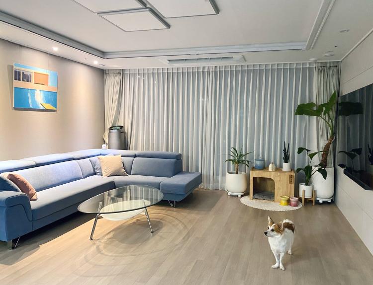 여름맞이 집 안 분위기 바꿔주려고 액자레일 설치해서 시원한 그림 달았어요 ◡̈ 넘 시원해보이는 데이비드호크니 그림💙