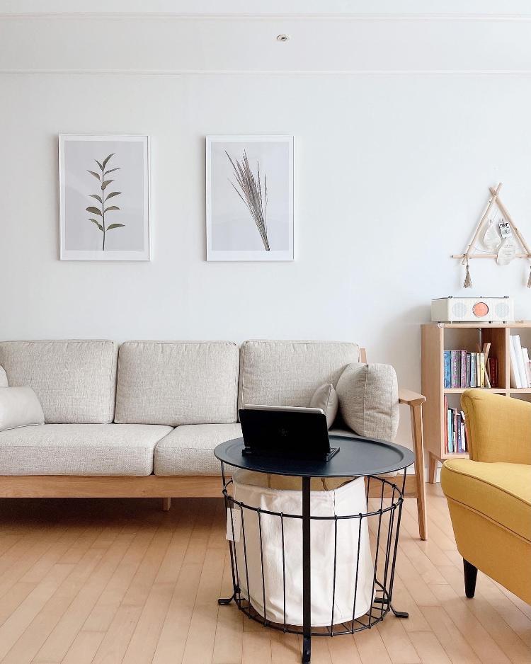 오픈된 수납형 테이블에 패브릭 바구니를 넣어봤어요.