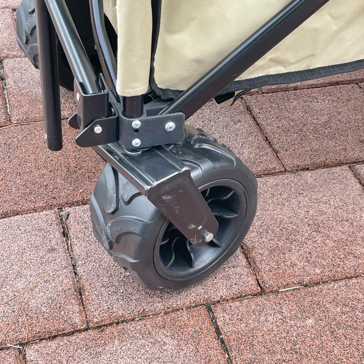 바퀴만 따로 찍어봤는데 바퀴가 정말 튼튼하게 생겼어요ㅎㅎ 색감도 정말 예쁘구요. 감성 캠핑에 딱인 웨건입니다! 요즘 캠핑을 잘 못가서 동네에서 끌고 다녀봤는데, 아이가 타고 싶어해서 태우고 다녔는데 아주 안정감 있고 튼튼합니다!:)