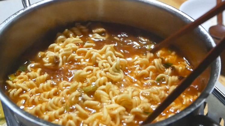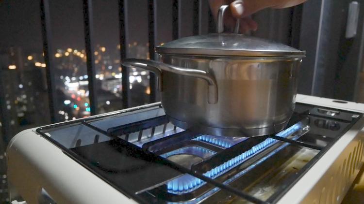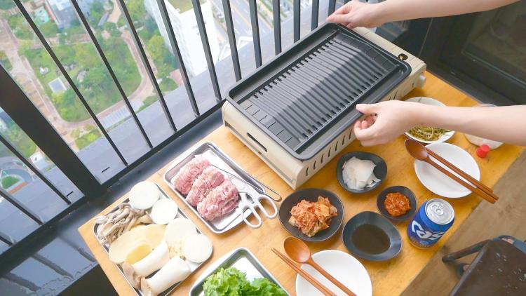 사이즈가 오버되지만 않는다면 왠만한 냄비, 팬은 다 올릴 수 있으니 엄청 실용적이에요. 오늘의 후식은 라면! 밤에 테라스에서 먹는 라면은 세상 맛있잖아요. 🤭❤️