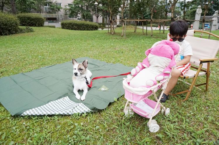 바닥이 젖은 상태라 방수체크원단이 아래로 가게 깔았구요. 주변은 축축했지만 캠크닉시리즈 방수매트 덕분에 아이와 저 강아지는 보송보송하게 잘 놀고, 쉬다 들어왔어요!