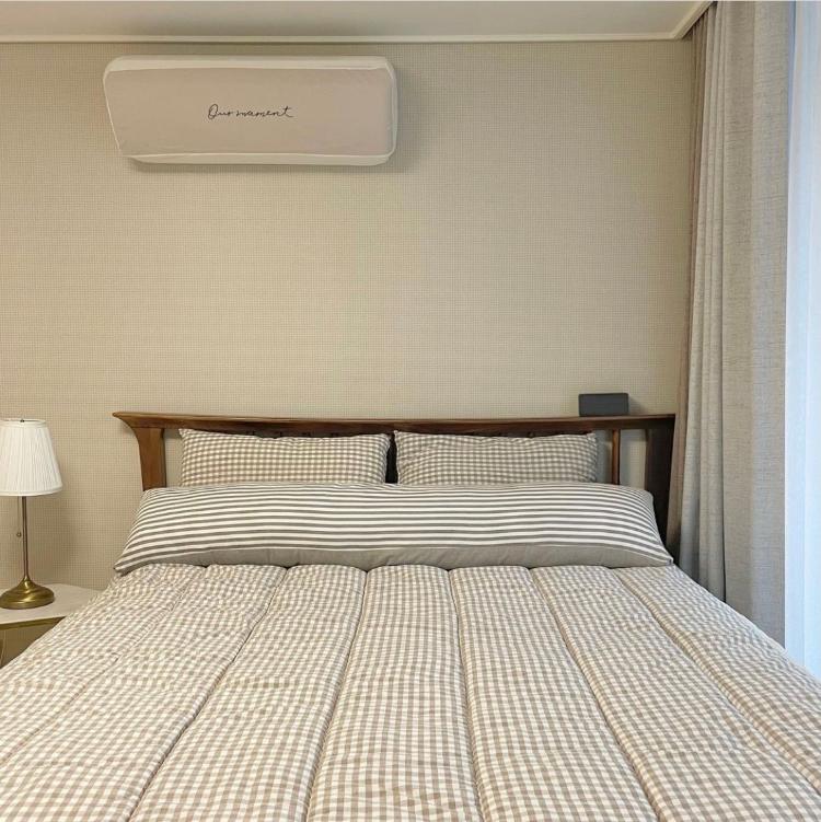 가을 무드로 변신한 침실이에요~! 베이지색 침구로 가을 느낌이 나도록 했고, 에어컨도 커버를 씌워주었어요^^
