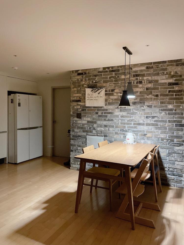 셀프 파벽돌 시공+원목식탁 매끄럽지 못한 곳도 있지만 홈까페 분위기 물씬나요🤍