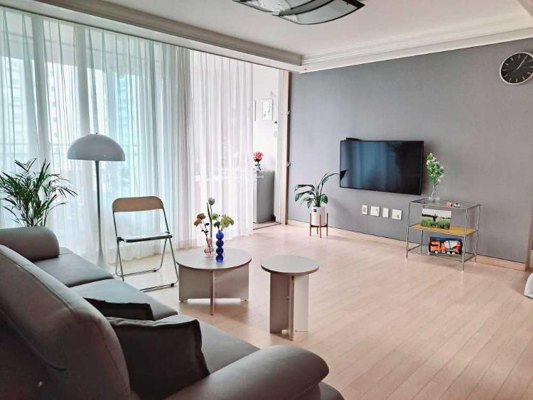 가을 바람이 커튼을 날리는 거실이에요