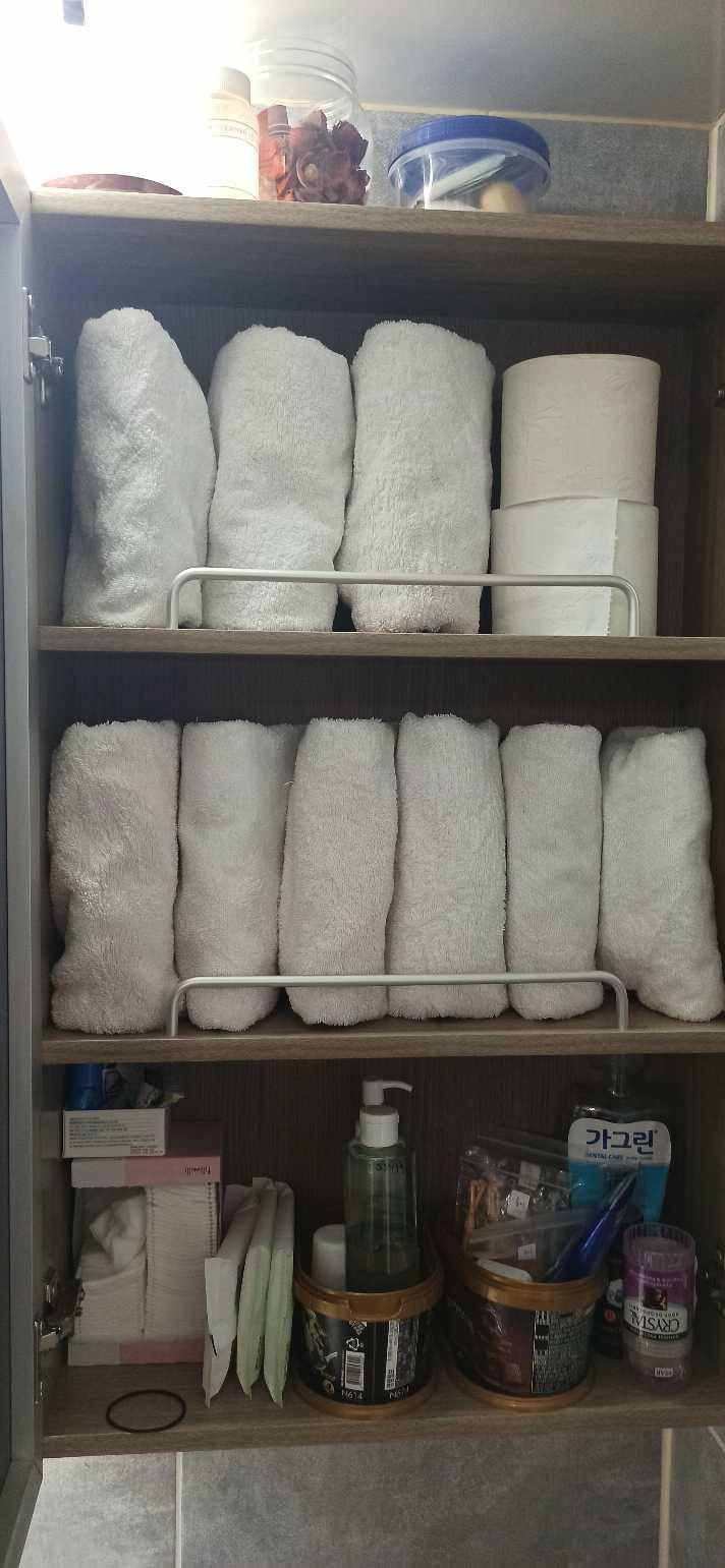 화장실 선반이에요 수건과 욕실물품 정리했어요