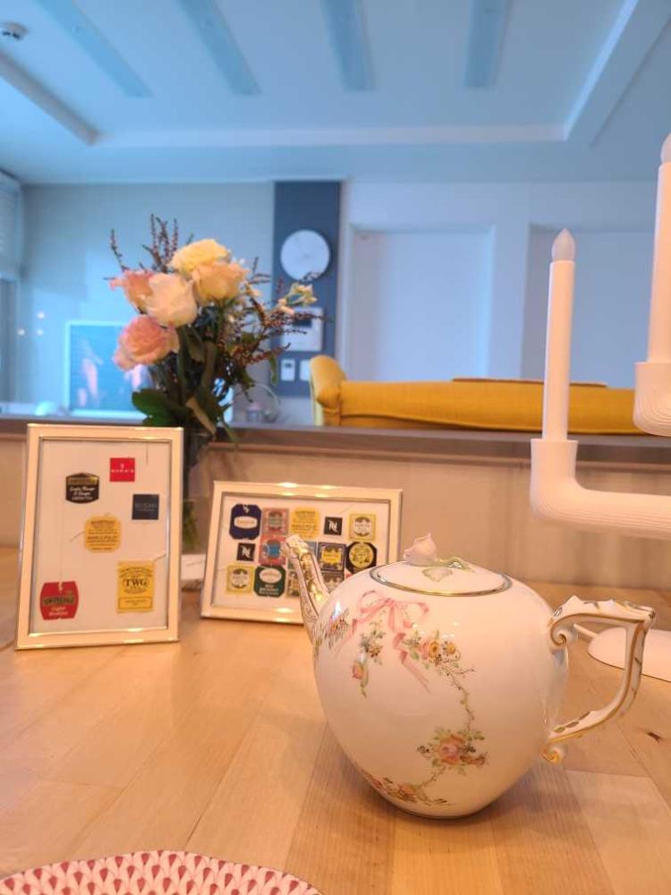 홍차레이블로 직접 만든 액자 2개와 새로 산 헤렌드 티팟