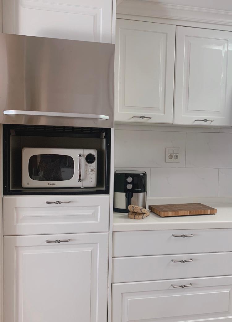 화이트 전자레인지가 주방 상부장들과 잘 어울려서 잘 골랐다 싶어요!