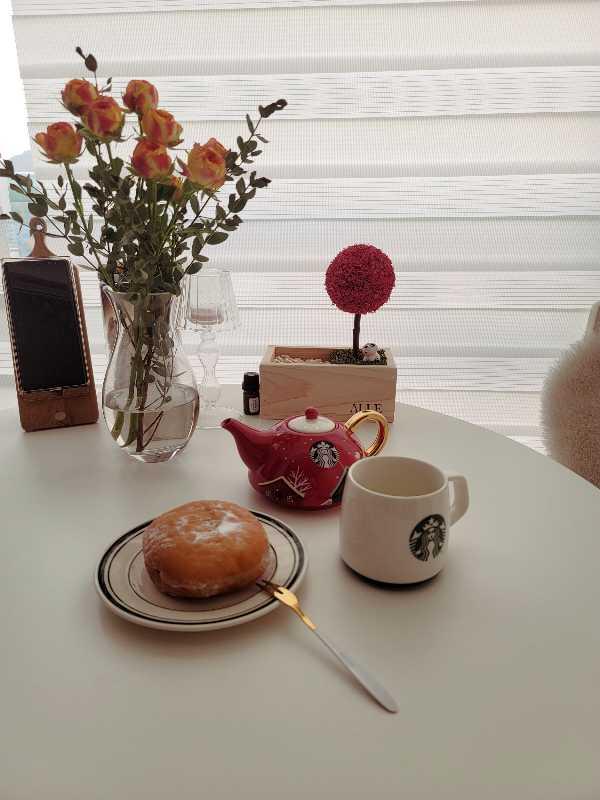 따뜻한 차가 생각나서 새로 산 티팟이랑 도넛으로