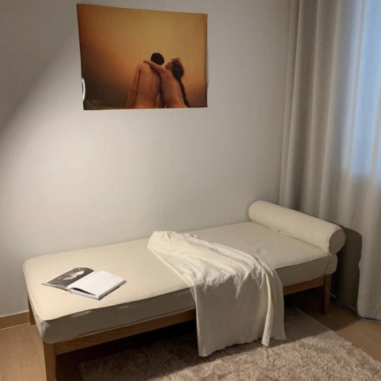 작은방은 취미공간으로 미술용품과 잠시 쉴 수 있는 데이베드를 두고 쇼파겸 쓰고 있습니다🥨 좋아하는 사진작가 린다 매카트니 포스터도 걸어주었어요~🤍✨✨