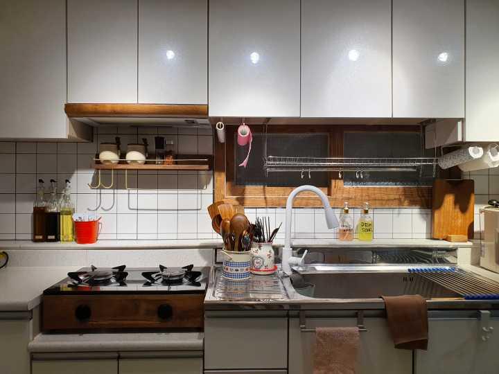수전을 타일과 맞춤으로 화이트로 바꿔줬고 선반을 몬스터겔로 붙여주고 조미료통도 예쁜걸로 바꿔주고, 주방 조리기기들도 모두 우드로 맞춰주니 주방이 예뻐졌어요:)