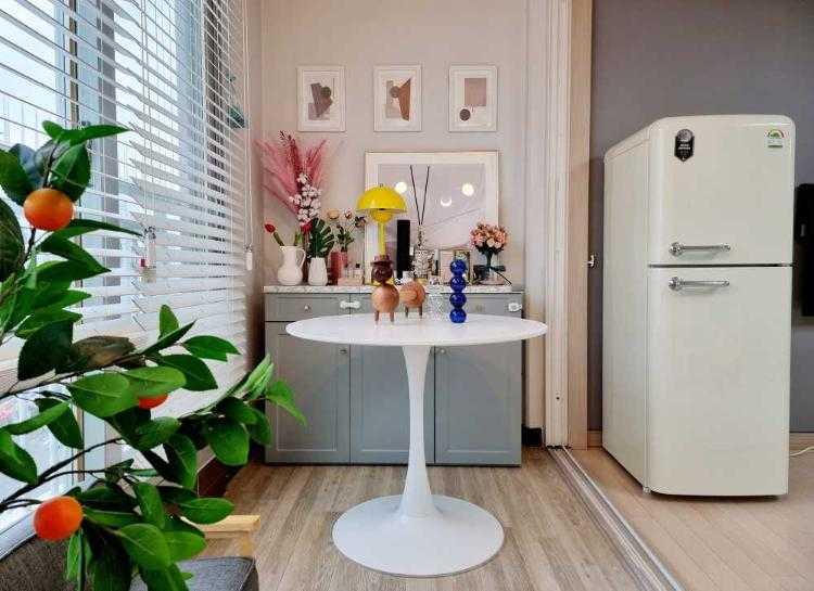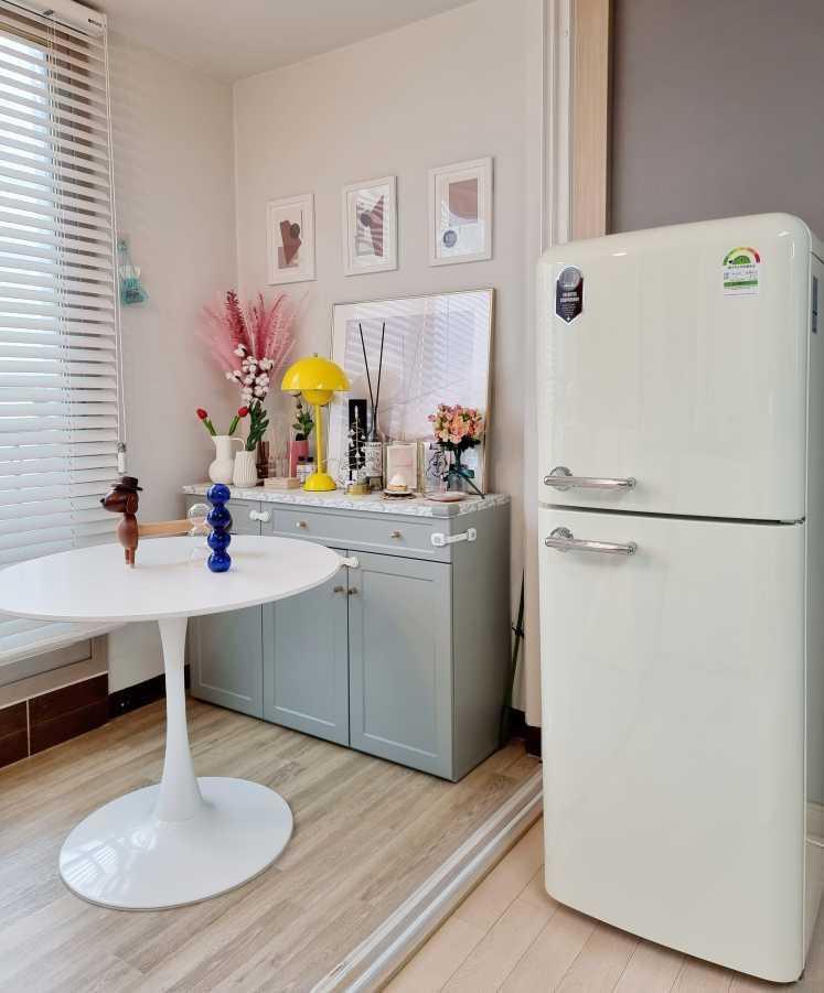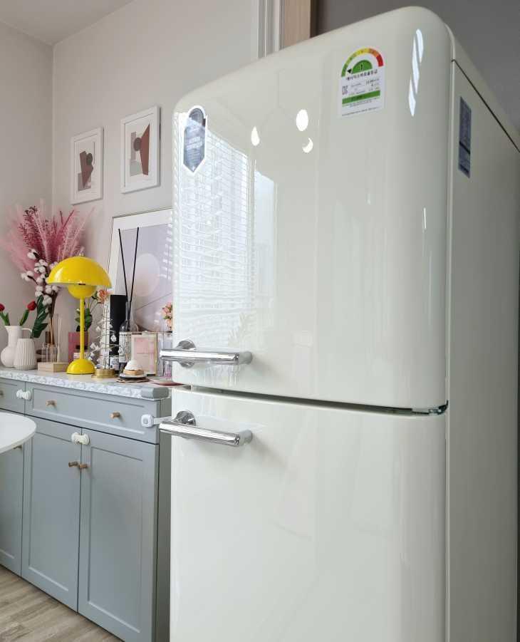 아이보리 컬러가 예쁜 오리온 창홍 레트로냉장고에요