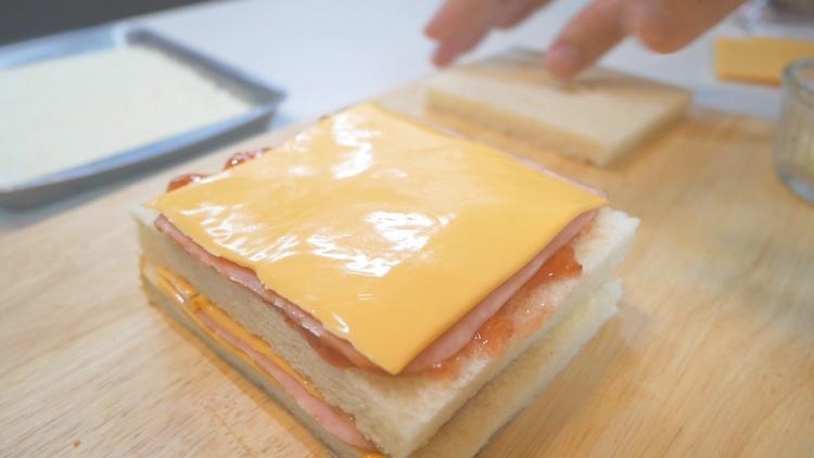 이제 준비한 재료를 층층히 잘~ 올려주기만 하면 끝! 저는 마요네즈, 체다치즈, 슬라이스햄, 체다치즈, 식빵, 딸기잼, 슬라이스햄, 체다치즈 이 순서로 올렸어요 ㅋㅋㅋ 마지막으로 달걀물이랑 빵가루를 곱게 입혀주면~ 에프 들어갈 준비 끝!