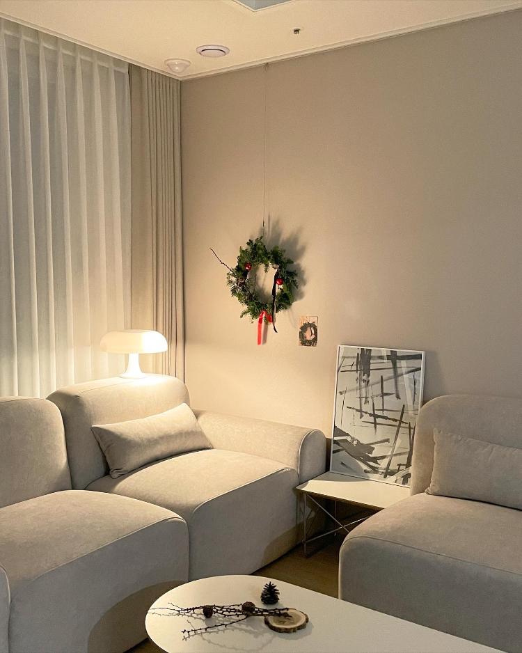 어둑한 거실에 작고 귀여운 리스로 크리스마스 맞이 🎄❤️💚