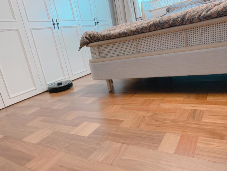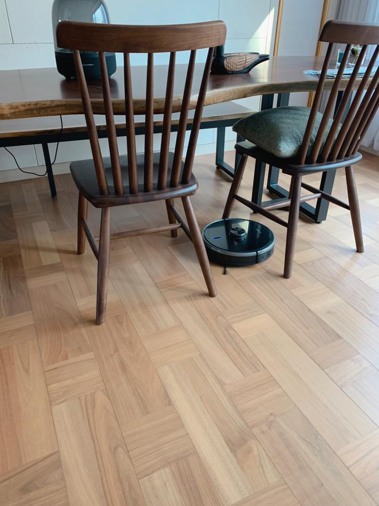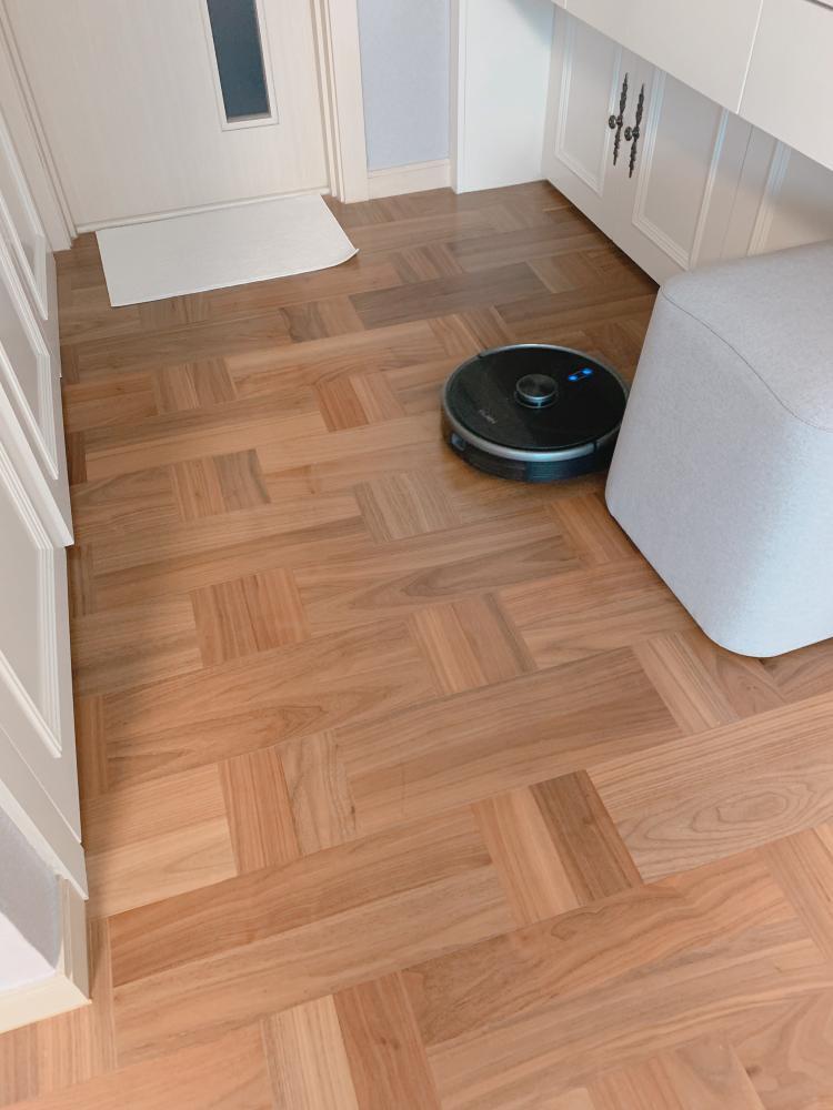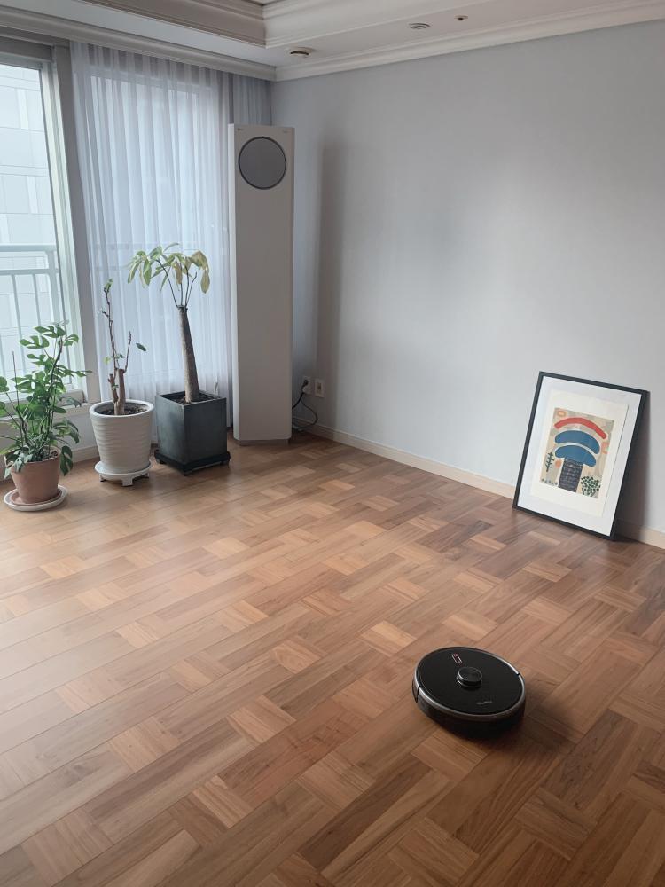 넓은 거실에 우드슬랩 하나만 있어서 청소가장 힘든데 열심히 로봇청소기가 청소해주고있어요.