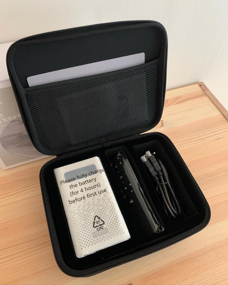 전용파우치에 담겨있어 가정이나 캠핑에서 휴대하기 좋은 빔프로젝터네요.