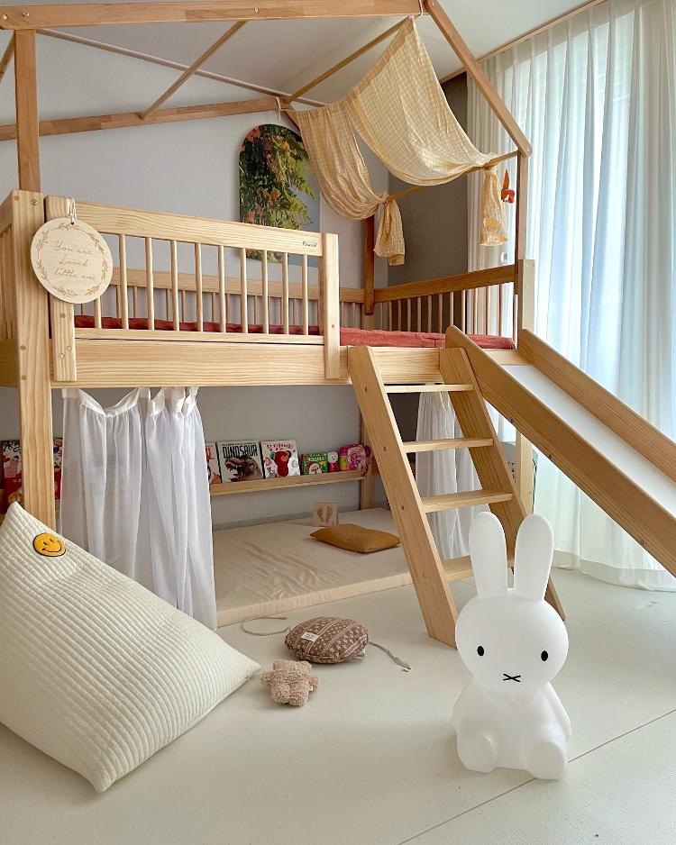 아이방 침대 1층에 교구장을 치우고 토퍼를 깔아주었어요