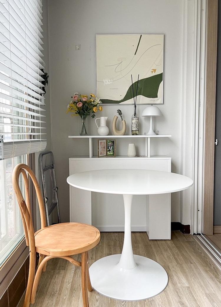 베란다에는 화이트 테이블을 두었어요 날이 얼른 따뜻해졌으면 해요