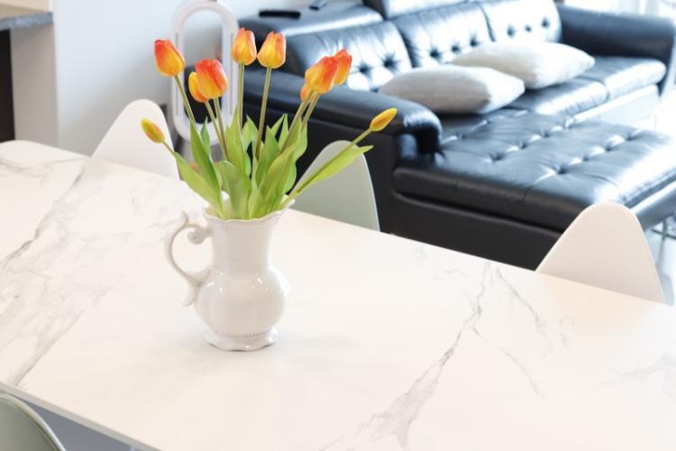 우리집 식탁은 이태리 포쉐린 타일로 주문 제작 된 카라카타테이블이에요:) 8인용 식탁이라 여유롭게 앉아 식사를 즐길 수 있답니다.