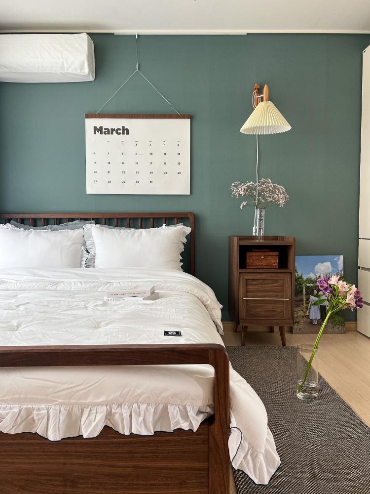 월넛컬러와 그린벽지가 있는 침실이에요