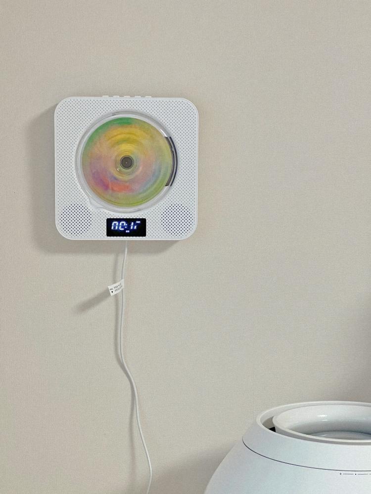 라탄으로 제작한 리스 대신 아이를 위한 CD플레이어를 두었어요.