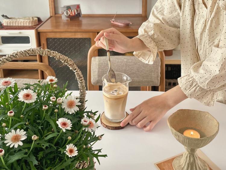 남편이 사온 작은 꽃화분을 바구니에 담아 거실에서 홈카페 즐기기